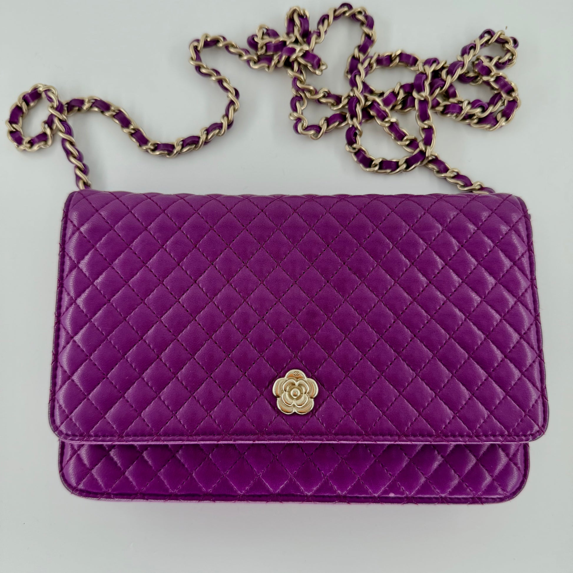 Discover elegance embodied in this preloved CHANEL Purple Quilted Crossbody Bag with Wallet on Chain, delicately adorned with the signature camellia flower embellishment. Its rich purple hue and classic quilting reflect refined taste, while the compact design offers versatility and convenience. Perfectly balancing sophistication with charm, this piece complements any ensemble with subtle luxury.