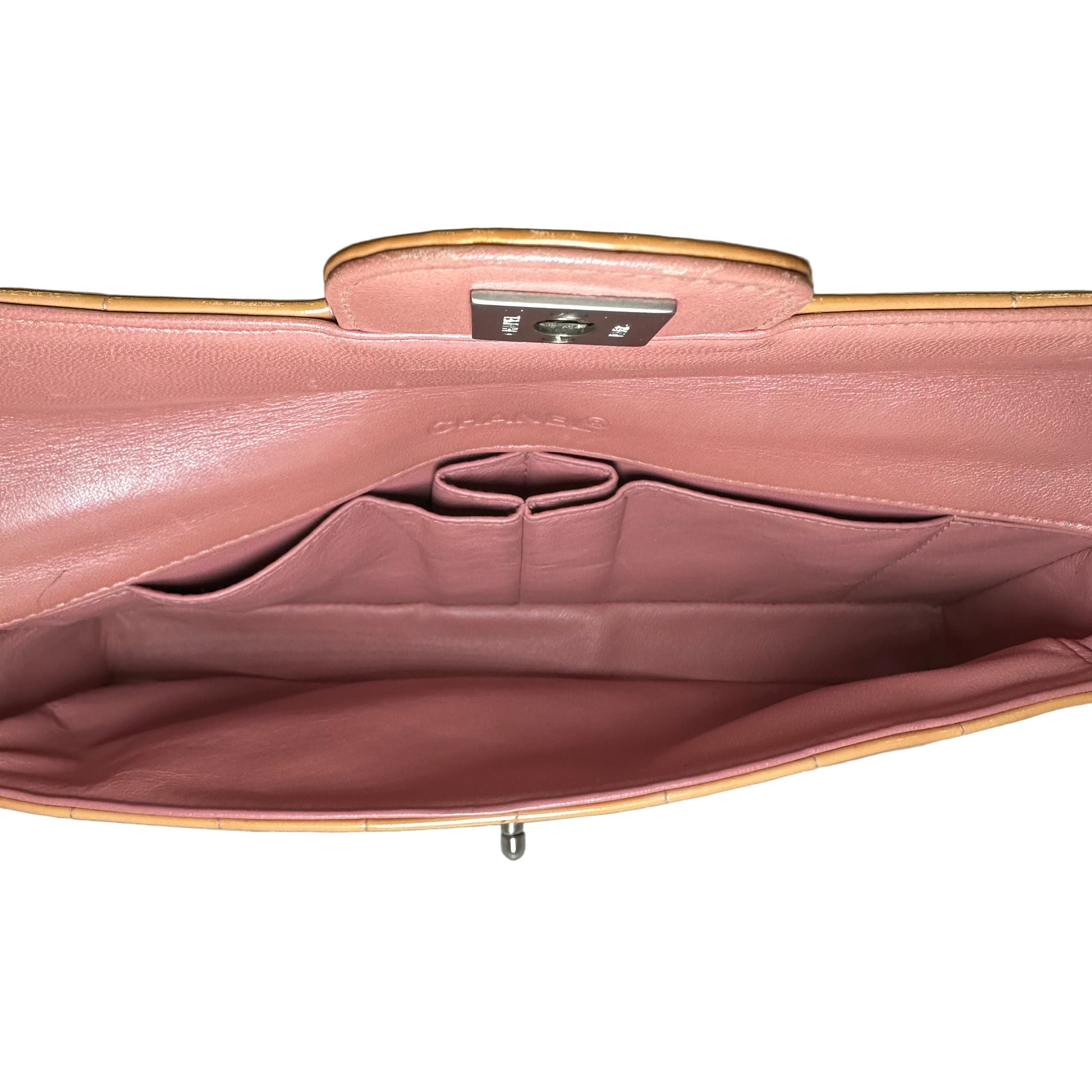 Elevate your collection with this Preloved Chanel Peach Orange Chocolate Bar Single Flap bag. Featuring a distinctive tan and orange exterior with a charming pink lining, it blends timeless elegance with a subtle pop of color. Its classic structure and refined detailing make it a versatile accessory for sophisticated, everyday style.